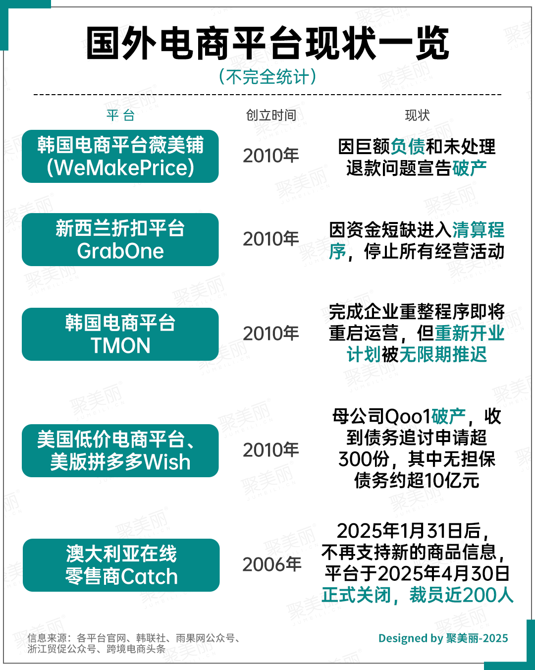 聚美麗梳理部分國外電商平臺現(xiàn)狀來看,除文章開頭提到的薇美鋪(WeMakePrice)外,近年來GrabOne、TMON、Wish、Catch等多家電商平臺已宣告走入破產、關閉等不利局面。