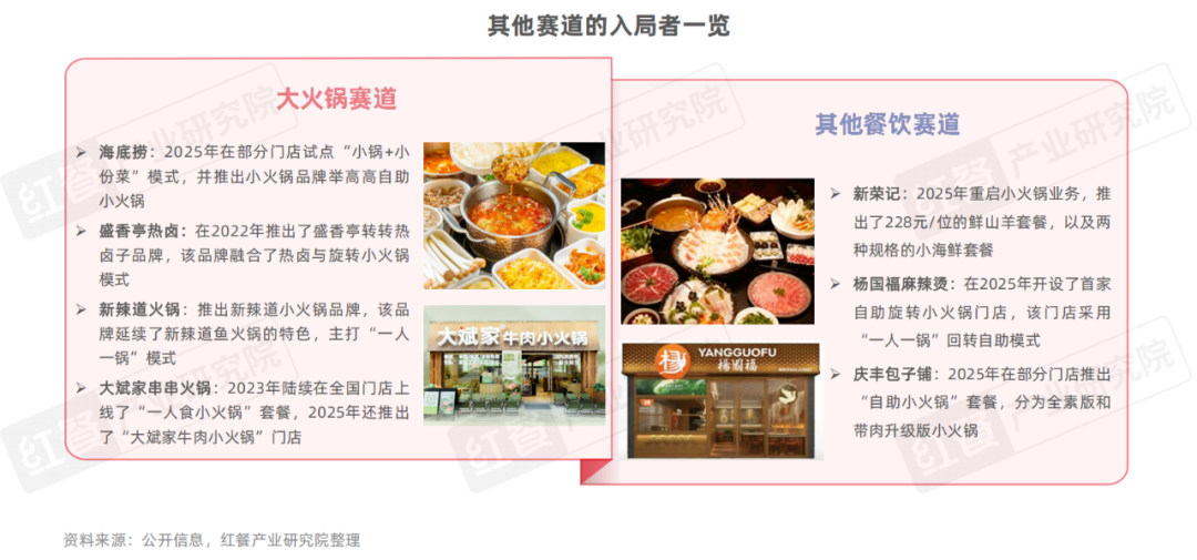 例如,大火鍋賽道中,海底撈推出了“小鍋+小份菜”產(chǎn)品,還孵化了沸派·甄鮮小火鍋子品牌和收購了舉高高自助小火鍋品牌;中式正餐賽道中,新榮記在2025年重啟小火鍋業(yè)務;麻辣燙賽道中,楊國福麻辣燙開設了首家自助旋轉小火鍋門店。