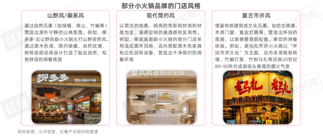 在門店風格層面,早期小火鍋門店多以紅白經(jīng)典配色為主,風格較為單一。近年來,小火鍋品牌的門店風格更注重場景化設計,打造更精致、干凈的用餐環(huán)境,以契合年輕人的審美需求。