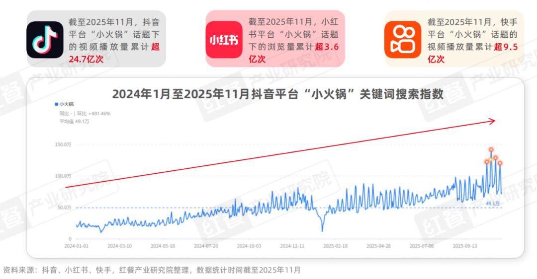 同時,在各個社交平臺上,“小火鍋”相關話題也獲得了較高的熱度。截至2025年11月,抖音平臺上“小火鍋”話題的視頻播放量超24.7億次;小紅書平臺“小火鍋”話題的瀏覽量累計超3.6億次,快手平臺“小火鍋”話題的視頻播放量超9.5億次。