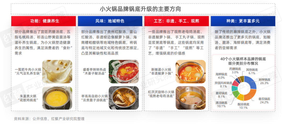 在功能方面,部分品牌推出了宮廷藥膳湯底、五指毛桃雞湯、祁連山野黃菇菌湯等滋補養(yǎng)生鍋底,滿足消費者的“食補”需求。