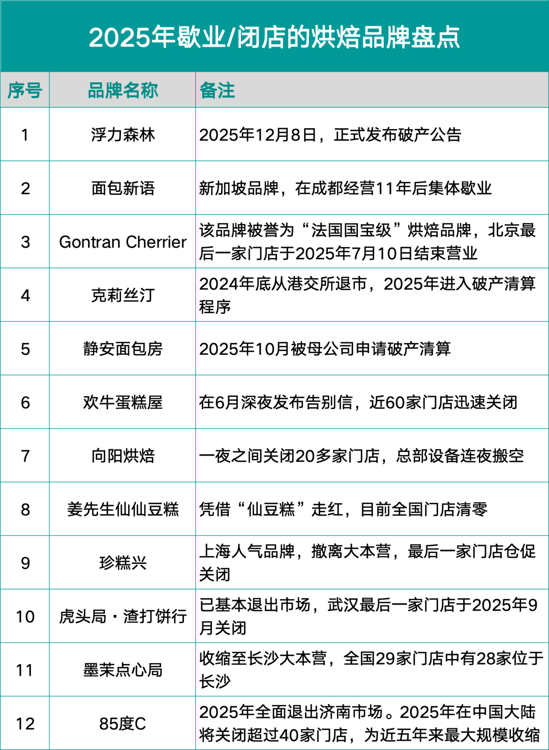 國際品牌退潮的同時,本土烘焙企業(yè)面臨的挑戰(zhàn)更為復(fù)雜和嚴峻,倒閉潮席卷了從全國性連鎖到區(qū)域網(wǎng)紅的各個層級。