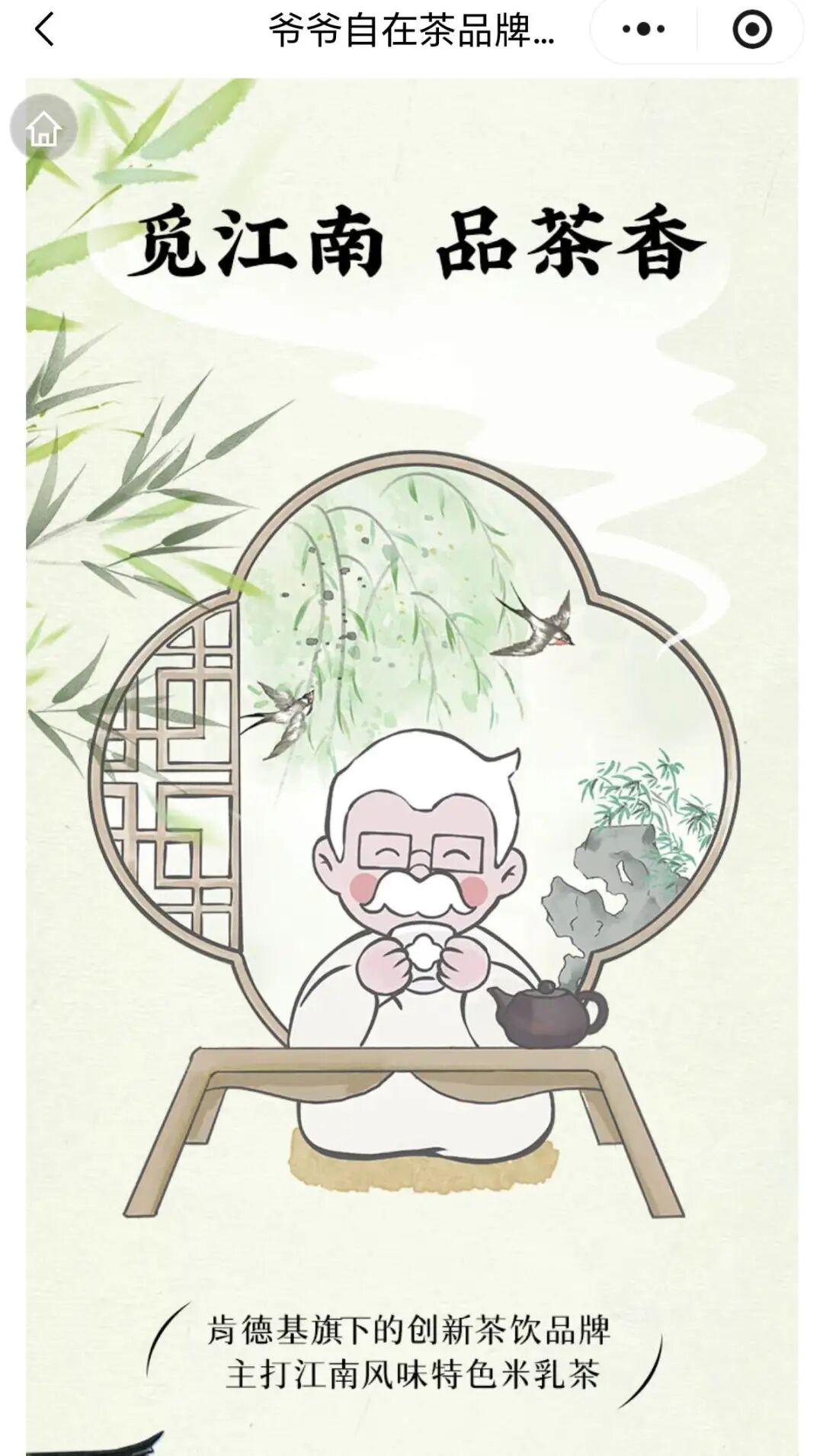 其中之一是主打江南風(fēng)味特色米乳茶的“爺爺自在茶”,核心產(chǎn)品包括煙雨龍井米乳茶、茉香白玉、神隱·檀香米乳茶、巖韻大紅袍米乳茶等,從視覺和味覺上都具有強(qiáng)烈的中國風(fēng)韻和江南特色。2022年6月30日,“爺爺自在茶”在蘇州開出全國首店,其logo是粉色背景上一個笑呵呵的肯德基爺爺?shù)目ㄍㄐ蜗蟆?dāng)然,這家店也和肯德基開在同一個商場內(nèi)。