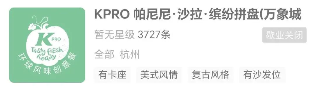 早在2017年,肯德基就已經(jīng)試水輕食,在杭州萬象城開出了第一家KPRO門店,此后多年間,擴(kuò)店不算激進(jìn)。但從現(xiàn)存資料看,當(dāng)時肯德基對KPRO的定位更接近中高端輕食餐廳,在招牌上自稱為“環(huán)球風(fēng)味創(chuàng)意餐”,注重餐廳自身的“氛圍感”,人均價格在60元左右。刺猬公社在大眾點(diǎn)評、高德地圖等平臺搜索后發(fā)現(xiàn),KPRO首店當(dāng)前已處于歇業(yè)關(guān)閉狀態(tài)。