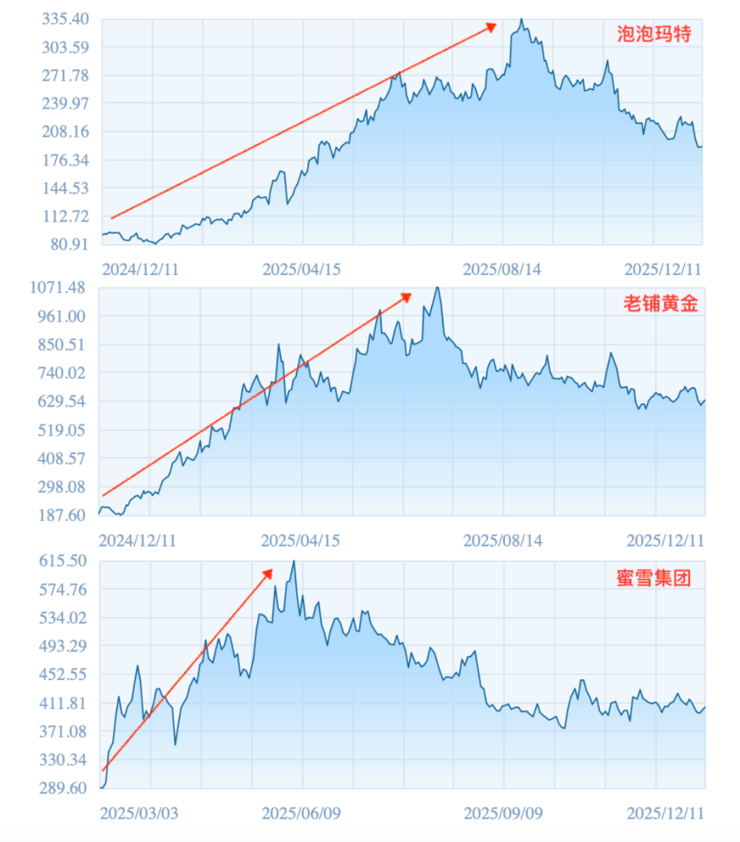 但今年,消費投資似乎有所回暖,甚至又開始出現(xiàn)機構(gòu)搶項目的情況。這跟當年消費遇冷的節(jié)奏太像了:二級市場反向傳導(dǎo)——2025年,“港股三姐妹”(蜜雪冰城、泡泡瑪特、老鋪黃金)的表現(xiàn)可圈可點,三家公司的總市值一度超7000億港元,帶動港股消費板塊整體上行。同時還有滬上阿姨、古茗、布魯可、霸王茶姬等明星公司成功IPO,讓不少投資人大獲豐收。