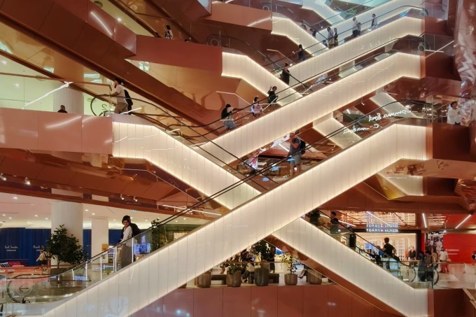 整體采用工業(yè)風設計,裸露的天花管線、黑漆裸頂、金屬質(zhì)感扶梯、雜而不亂的拼砌墻面等元素,營造出獨特的視覺感受。同時,商場內(nèi)設置了超過500個LED熒屏及天花板處的立體LED投射,營造出濃濃的奢華感。