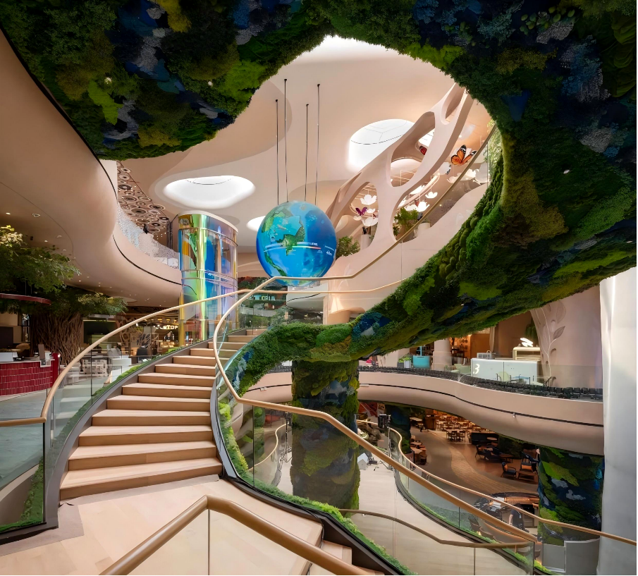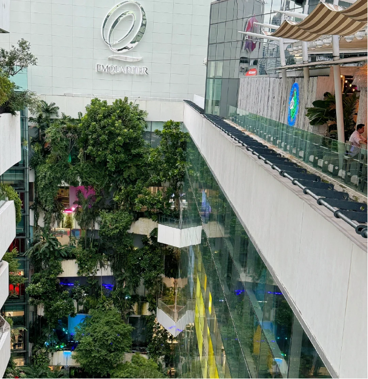 曼谷的氣候條件得天獨厚,使得商場能夠大量引入綠植元素,無論是屋頂綠化、垂直綠墻還是中庭景觀,都極大地豐富了商業(yè)空間的視覺層次。這種綠色生態(tài)的設計不僅美化了環(huán)境,也為顧客提供了一個放松身心的休閑空間。例如,EMQUARTIER商場通過立體綠化裝飾,擁有高達30%至40%的綠色空間,使得購物體驗更加愉悅和放松。