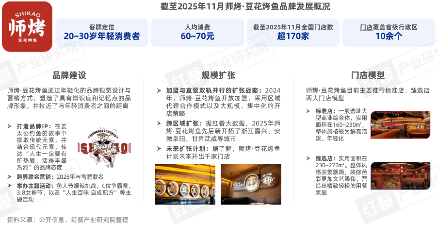 據(jù)紅餐大數(shù)據(jù),截至2025年11月,其全國門店數(shù)超過170家,覆蓋省級行政區(qū)10余個,覆蓋城市近40個。并隨著品牌持續(xù)發(fā)展,師烤·豆花烤魚形成了標(biāo)準(zhǔn)店、臻選店兩大門店模型。