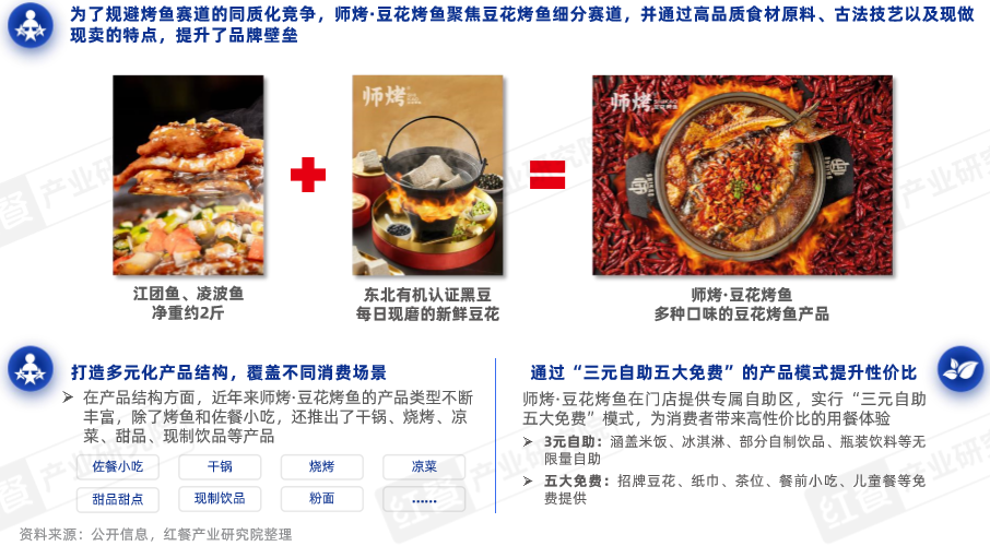 此外,為了給消費(fèi)者帶來更豐富的消費(fèi)體驗(yàn),師烤·豆花烤魚不斷豐富菜單結(jié)構(gòu),形成以烤魚為核心,干鍋、燒烤、涼菜、甜品甜點(diǎn)等為輔的復(fù)合產(chǎn)品結(jié)構(gòu)。同時,師烤·豆花烤魚通過“三元自助五大免費(fèi)”的產(chǎn)品增值服務(wù),提高品牌性價比。