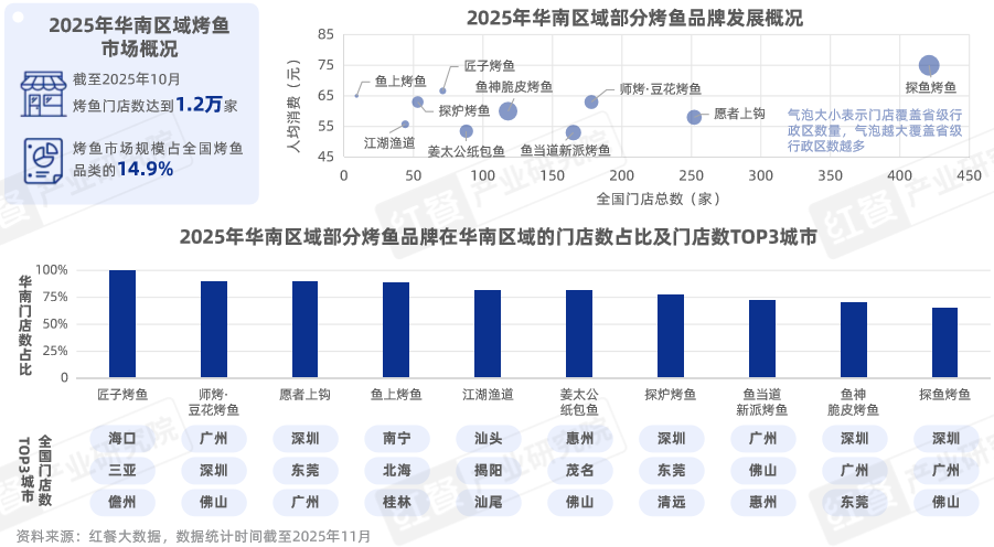 據(jù)紅餐大數(shù)據(jù),截至2025年10月,華南區(qū)域烤魚的烤魚市場份額占全國的14.9%,烤魚門店達(dá)到1.2萬家,并逐步誕生探魚烤魚、師烤·豆花烤魚、愿者上鉤等以華南為主要經(jīng)營腹地的連鎖烤魚品牌。