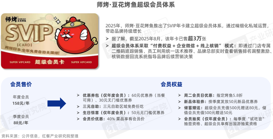 隨著餐飲行業(yè)的獲客成本逐步上升,私域運(yùn)營逐步受到烤魚品牌的重視。2025年,師烤·豆花烤魚提出了超級會員體系,通過年度和季度會員制度,將消費(fèi)者轉(zhuǎn)化為付費(fèi)用戶,構(gòu)建品牌私域流量。