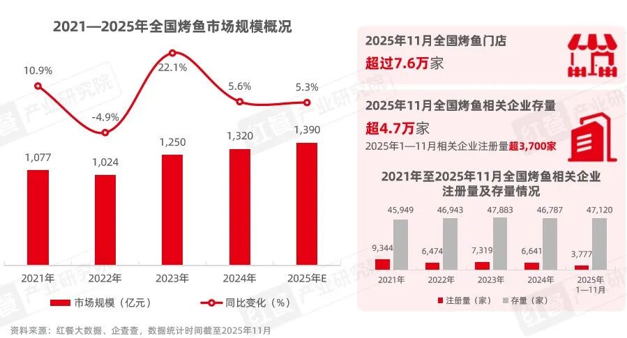 據(jù)紅餐大數(shù)據(jù),2025年烤魚市場規(guī)模將延續(xù)近年穩(wěn)定增長的發(fā)展態(tài)勢,預(yù)計(jì)接近1,400億元。門店方面來看,截至2025年11月,全國烤魚門店數(shù)量超過7.6萬家。同時,企查查顯示,全國烤魚相關(guān)企業(yè)存量超過4.7萬家。