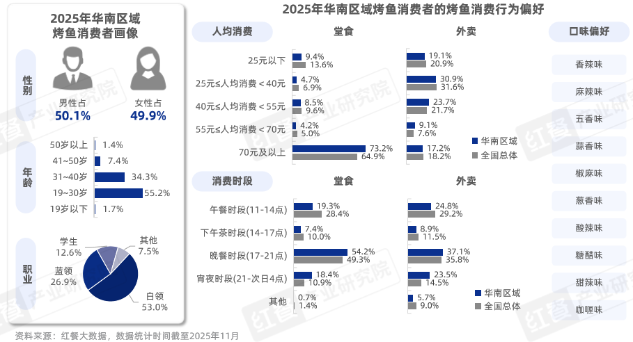 與華東區(qū)域相比,華南區(qū)域的烤魚消費(fèi)者在性別、年齡、職業(yè)分布上大體相同。不同的是,華南區(qū)域的烤魚消費(fèi)者在19~30歲、31~40歲兩個區(qū)間的占比均高于華東區(qū)域,且華南區(qū)域的藍(lán)領(lǐng)烤魚消費(fèi)群體占比同樣高于華東區(qū)域。