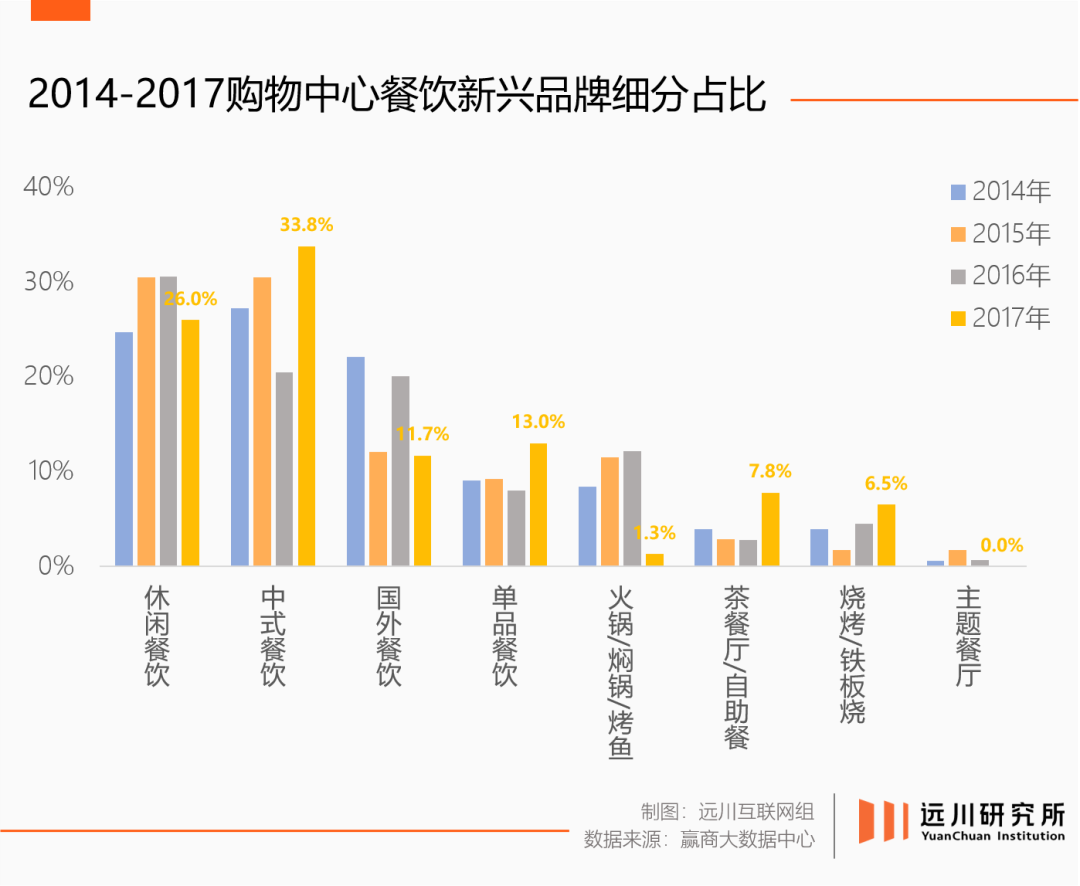 按照贏商的數(shù)據(jù)口徑,2014-2017年,新中式餐飲在購物中心的占比逐漸提升。太二、西貝、綠茶等成規(guī)模的餐飲品牌,頻頻出現(xiàn)在各大購物中心的首批入駐名單中。