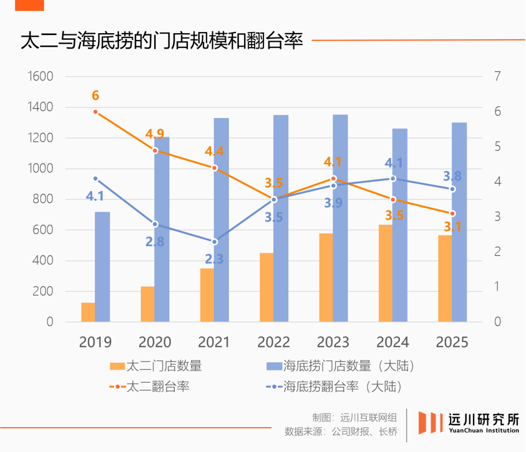 2019年后,以海底撈為代表,“中間地帶”的翻臺率和門店規(guī)模“脫鉤”,門店擴張開始稀釋單店效率,大部分品牌都選擇放緩開店甚至關(guān)店,保住單店效率。
