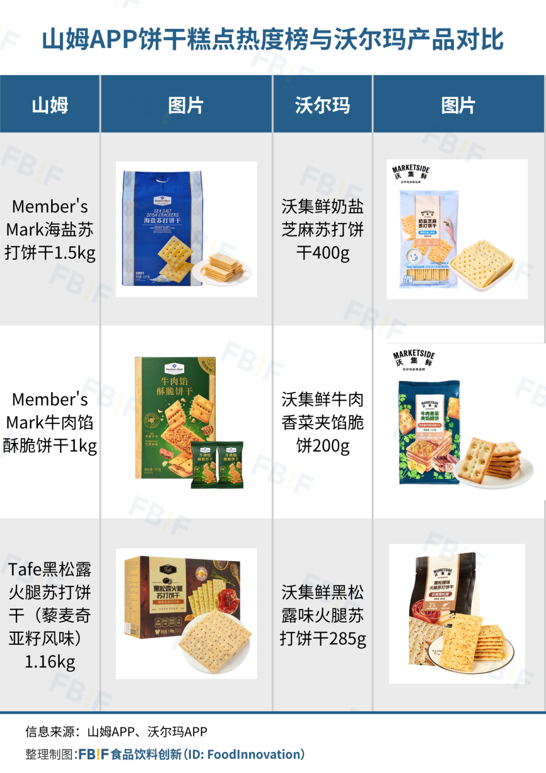 當然,這些產(chǎn)品并非1:1復刻。例如山姆的是“海鹽蘇打餅干”,而沃爾瑪則是“奶鹽芝麻蘇打餅干”,在口味和定位上做了微調(diào)。