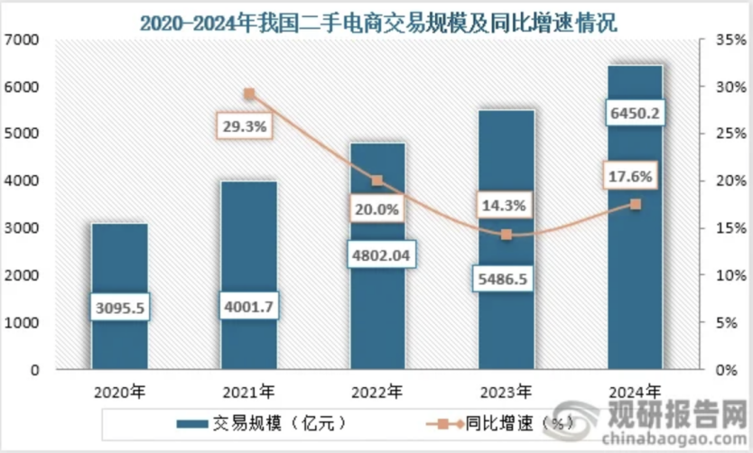 交易規(guī)模同步擴(kuò)大,2024年中國(guó)二手電商交易額6450.2億元,同比增長(zhǎng)17.56%,這一變化反映了二手市場(chǎng)逐漸從小眾走向主流。