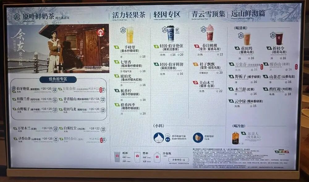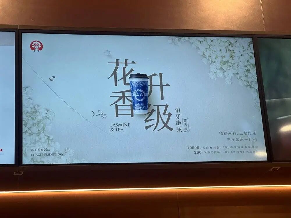 進(jìn)入12月,全國多地霸王茶姬門店電子屏上,都在滾動展示霸王茶姬的新品——伯牙絕弦花香款。