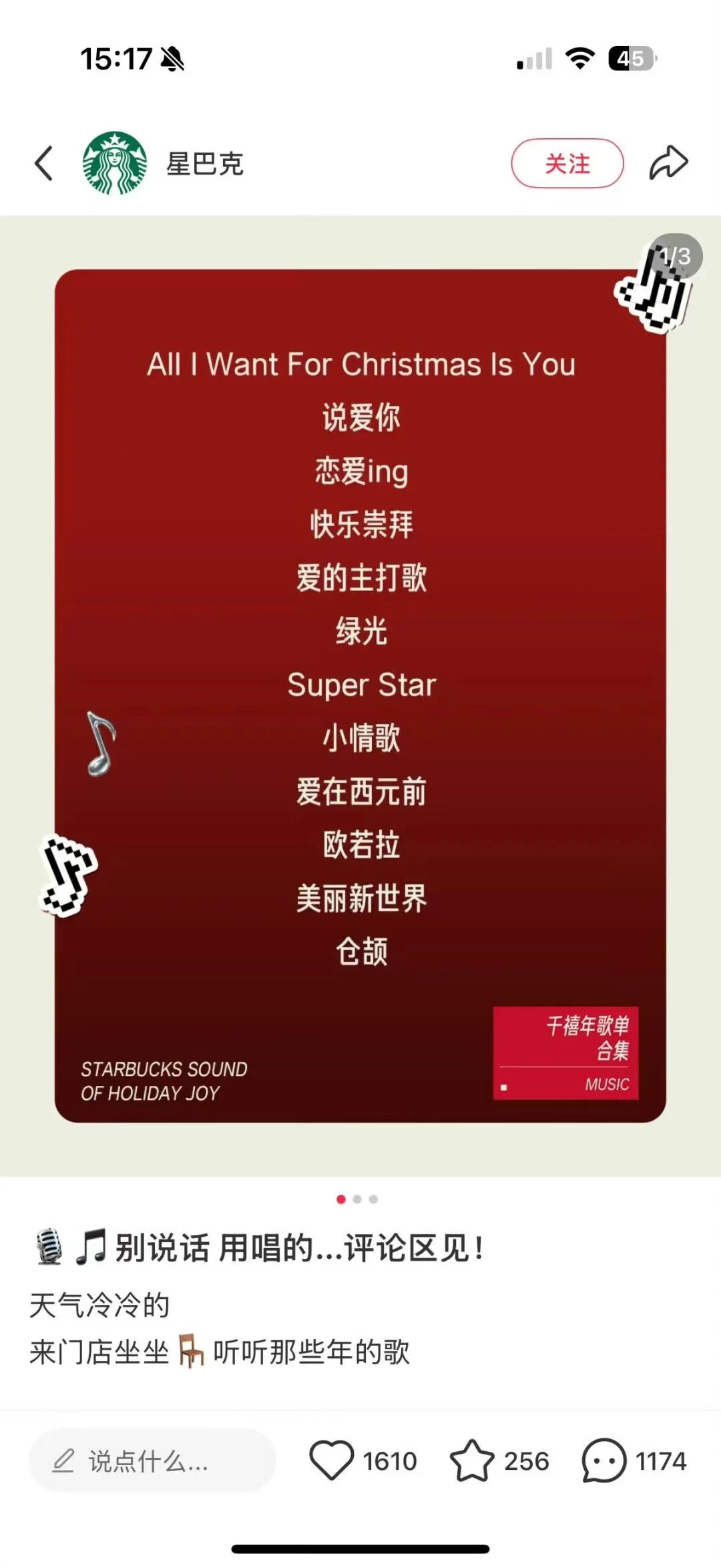 第三個關(guān)于店內(nèi),更“中國化”的表達(dá)是,星巴克中國店內(nèi)不再播放那些低調(diào)的爵士樂,反而開始更換成“KTV金曲”,綠光、快樂崇拜、戀愛ing等歌曲成為bgm。