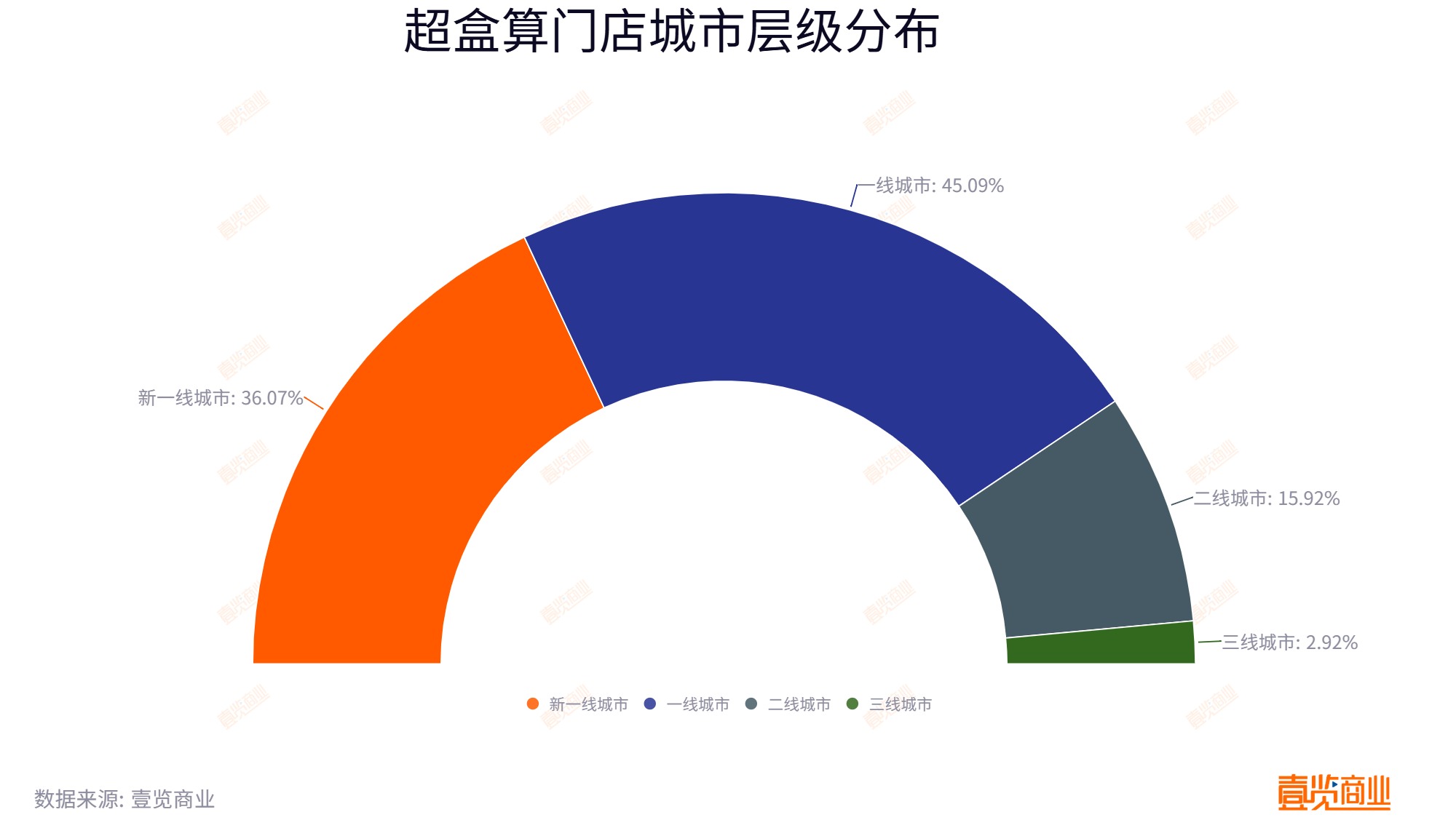 從城市層級看,超盒算偏好高線城市。一線城市門店達170家,占比45.09%,新一線城市門店136家,占比36.07%,二者合計占比超81%;二、三線城市門店71家,占比不足19%。