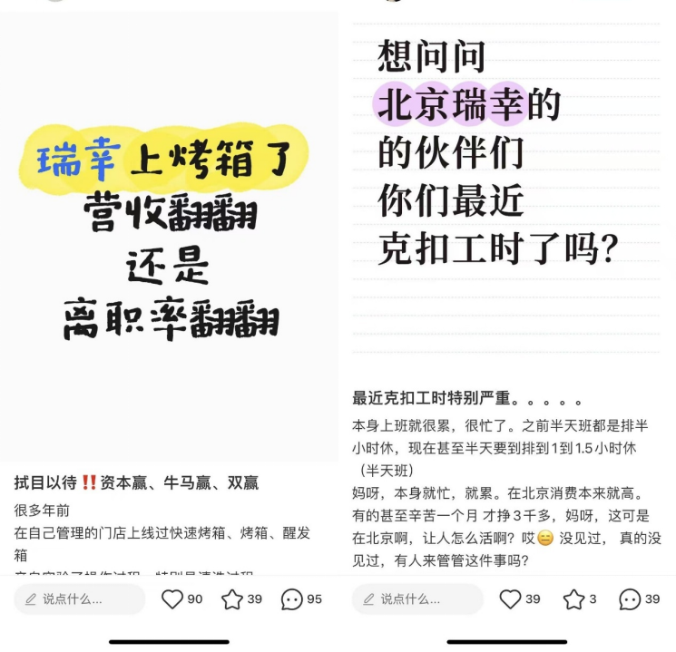 最近,瑞幸咖啡員工們的“火氣”有點(diǎn)大。先是瑞幸員工吐槽門店增加烤箱“忙不過來”;后又有自稱瑞幸員工的網(wǎng)友爆料,稱公司存在“克扣工時(shí)”等問題,瑞幸也因此站上了風(fēng)口浪尖。