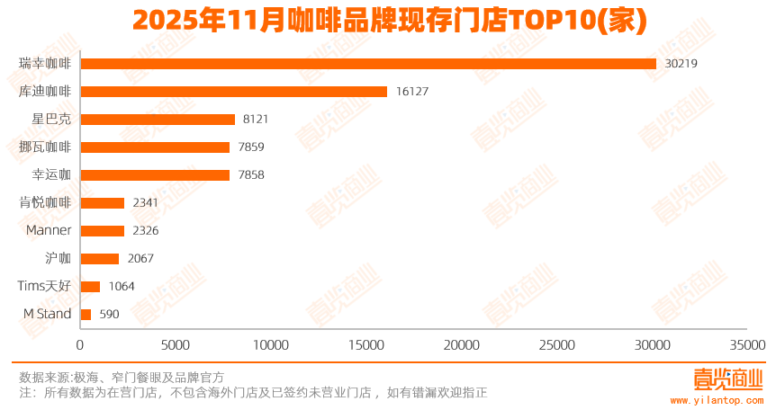 從現(xiàn)存門店規(guī)模來看,市場(chǎng)格局趨于“固化”,頭牌品牌持續(xù)穩(wěn)定擴(kuò)張,瑞幸咖啡以30219家門店斷層領(lǐng)先,占據(jù)現(xiàn)存門店總量的三分之一;庫迪咖啡以16127家門店位列第二,星巴克以8121家門店位列第三;7859家門店的挪瓦咖啡和7858家門店的幸運(yùn)咖分列第四第五。