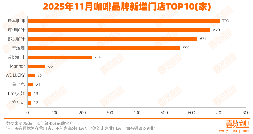 其中,瑞幸咖啡單月新增801家,占比超過四分之一,成為當(dāng)月拓店主力;庫迪咖啡和挪瓦咖啡緊隨其后,分別新增670家和621家;幸運(yùn)咖新增559家,肯悅咖啡新增234家。