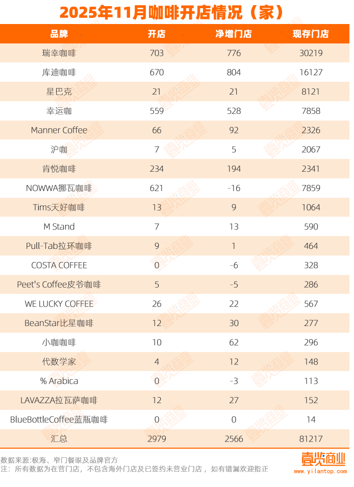 11月,壹覽商業(yè)長期跟蹤的20家連鎖咖啡品牌共新開2979家門店,同比增長75.64%;總門店突破8.1萬家,共計(jì)81217家,環(huán)比凈增2566家,整體規(guī)模持續(xù)擴(kuò)大。