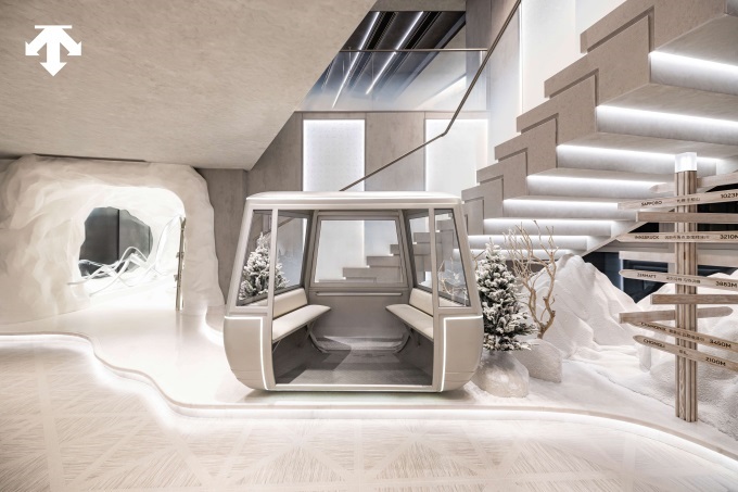 “專精之域”空間作為“未來之城”動線中的起始區(qū)域呈現(xiàn),該區(qū)域以滑雪為線索,圍繞迪桑特“一切始于滑雪”的品牌基因展開,通過五大山峰意象呈現(xiàn)品牌發(fā)展進程中的重要專業(yè)節(jié)點,并結(jié)合雪洞結(jié)構(gòu)、雪山纜車裝置與雪山指示牌等場景化展示,構(gòu)建出具有辨識度的冰雪語境。
