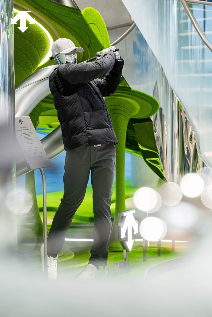 果嶺元素從裝置延展至整體空間設計,與周圍陳列系統(tǒng)形成統(tǒng)一的視覺體系,營造兼具專業(yè)屬性與未來感的高爾夫場域。圍繞該裝置,高爾夫系列產(chǎn)品集中呈現(xiàn),體現(xiàn)迪桑特在高爾夫裝備領域?qū)Y(jié)構(gòu)設計、運動適配與專業(yè)表現(xiàn)的長期投入。