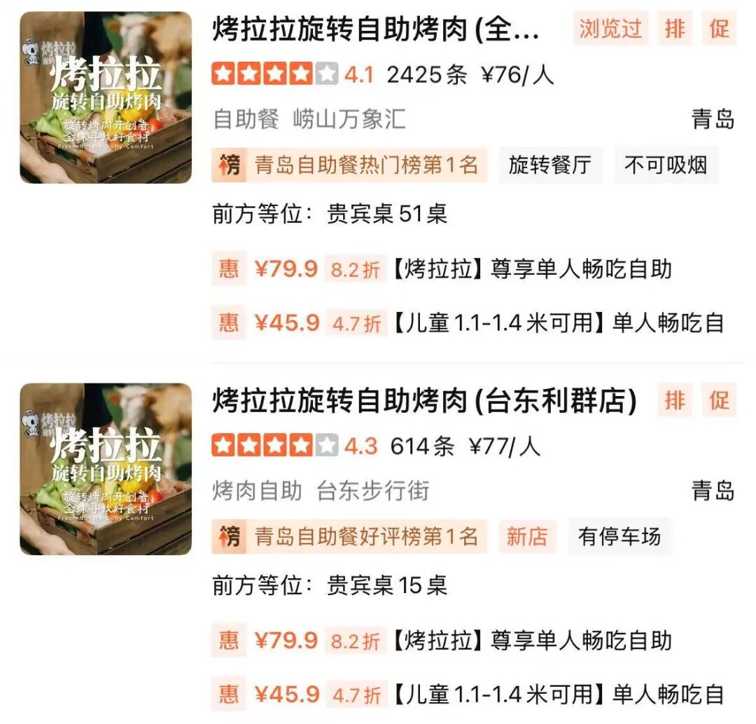 烤拉拉創(chuàng)立于2025年,客單價70多元,目前已開業(yè)的兩家門店,青島嶗山萬象匯店(全國首店)和臺東利群店分別登頂當?shù)亍白灾蜔衢T榜”和“自助餐好評榜”榜首,人氣頗高。