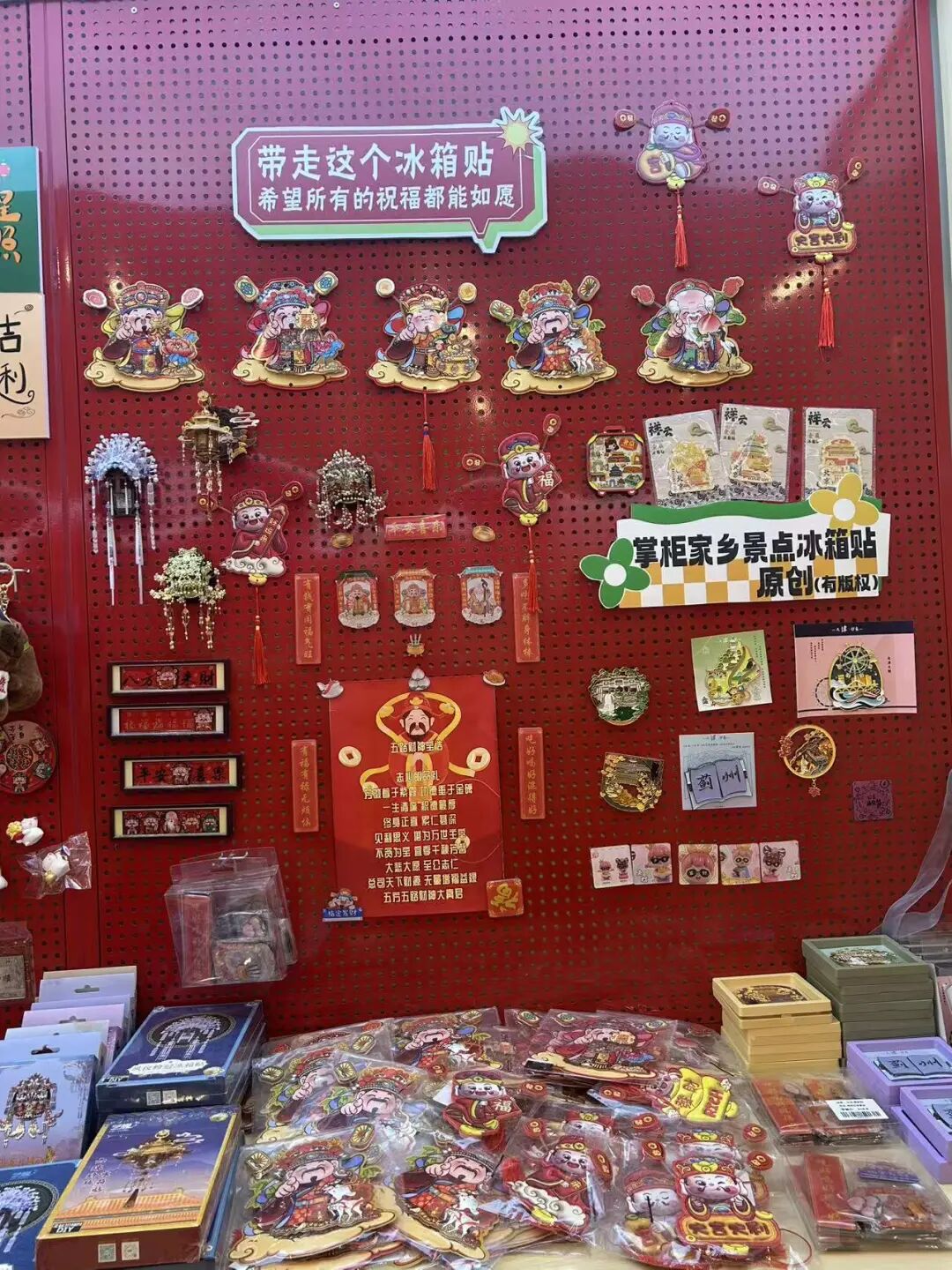 其老板曹先生透露,店鋪63平方米,硬裝花了28萬(wàn)元,主要靠商場(chǎng)自帶客流。店內(nèi)整體暖黃基調(diào),木質(zhì)柜架上擺著財(cái)神擺件、聚寶盆、DIY的發(fā)財(cái)樹(shù)等產(chǎn)品;墻上的紅色洞洞板上掛著招財(cái)冰箱貼、掛件、手串;門(mén)口最顯眼的位置則放了二創(chuàng)的泡泡瑪特潮玩吸引客流。