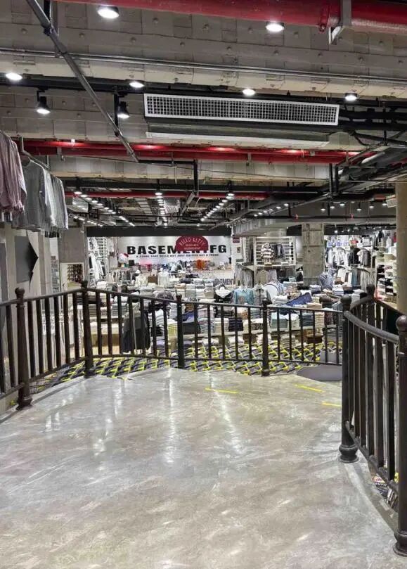 在人員配置上,無(wú)論是BF還是Basement FG,均是自助式購(gòu)物門(mén)店,沒(méi)有導(dǎo)購(gòu)人員。Basement FG武漢店,位置是下沉式的,從臨街的入口進(jìn)入后需通過(guò)電梯或樓梯進(jìn)入地下一層。工作日探訪(fǎng)時(shí),Basement FG武漢店僅有2名外場(chǎng)工作人員。其中一名負(fù)責(zé)整理衣服和收銀,另一名則負(fù)責(zé)站在入口指引客人進(jìn)入門(mén)店。