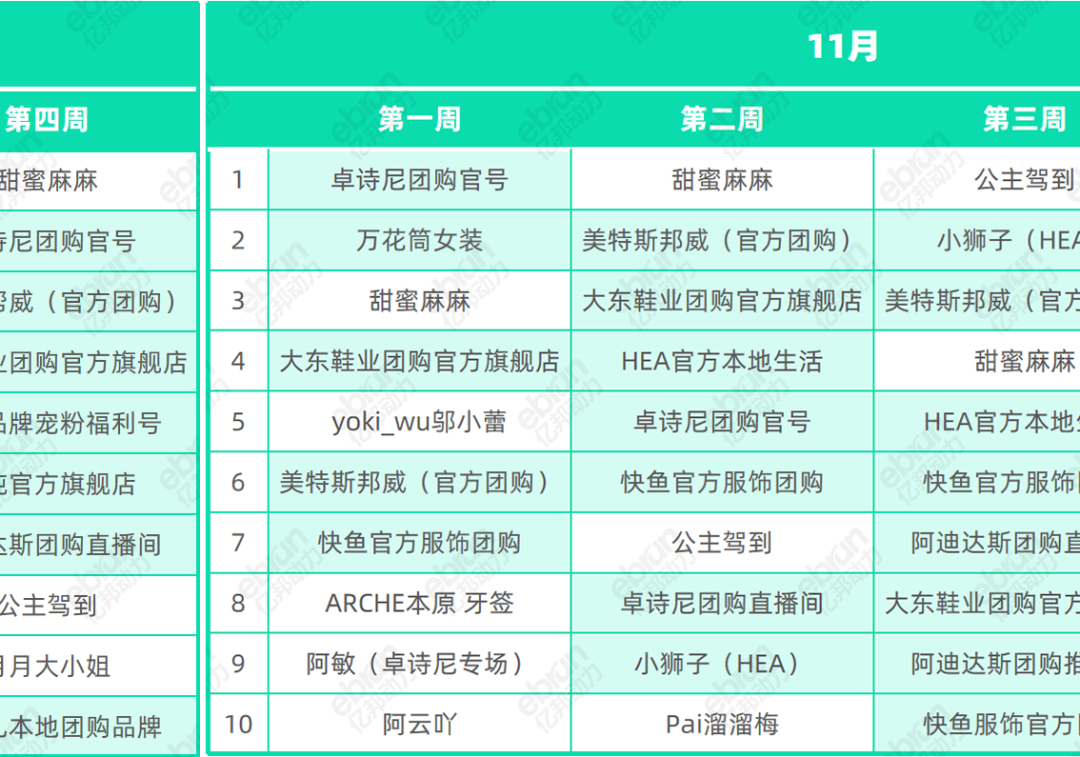 2025年第四季度,大東鞋業(yè)、卓詩(shī)尼、快魚(yú)、HEA、阿迪達(dá)斯、美特斯邦威、以純、紅豆......都通過(guò)這樣的方式,闖進(jìn)抖音生活服務(wù)全國(guó)潮流服飾榜。以下為榜單具體排名,其中標(biāo)綠賬號(hào)為品牌商家賬號(hào),其余為達(dá)人賬號(hào)。供大家參考:
