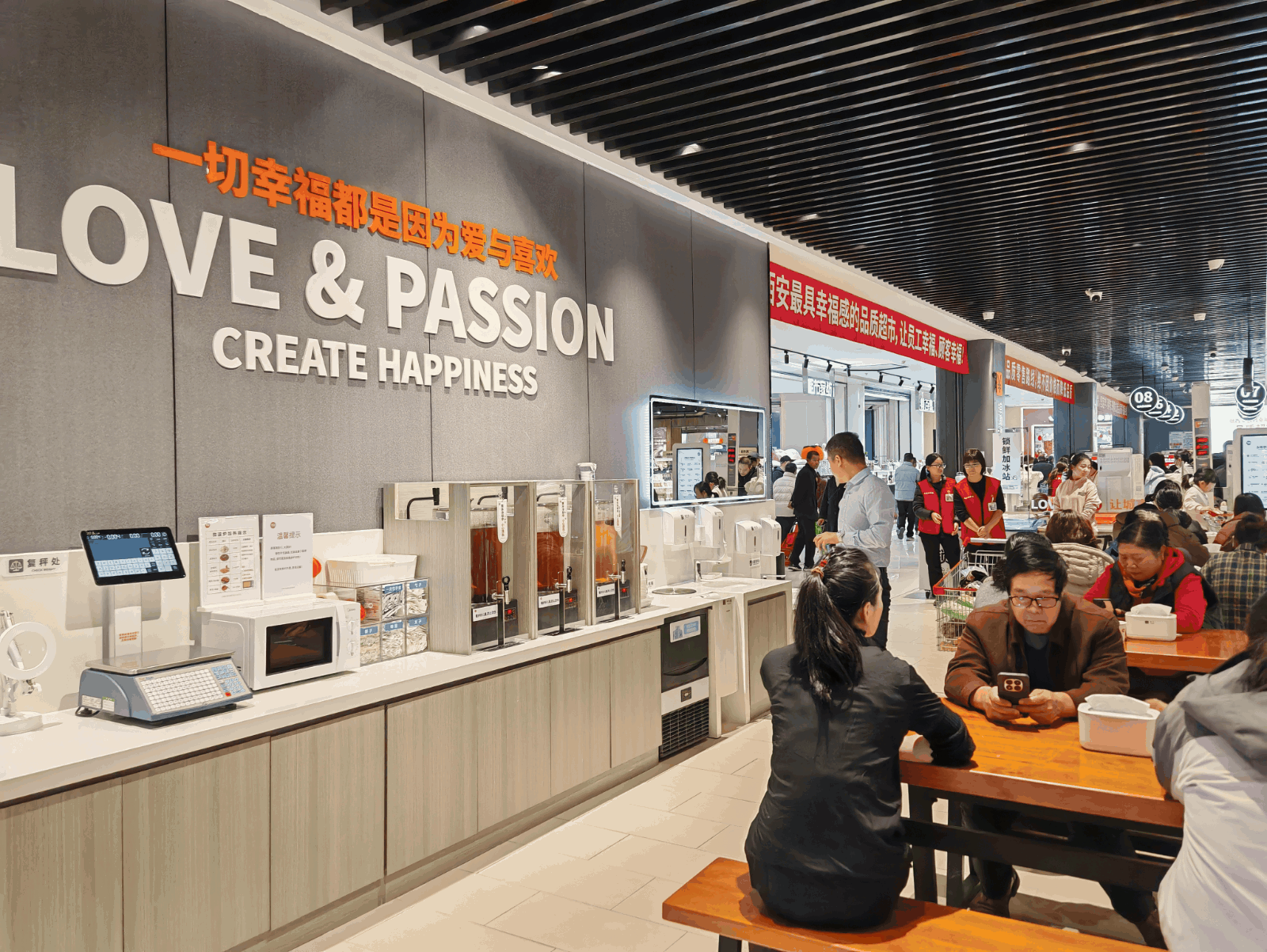 服務(wù)深度延伸:肉禽柜臺可提供切絲、絞肉等加工;海鮮柜臺支持清洗、切段乃至簡單烹制。便民設(shè)置無處不在:顧客休息區(qū)配備血壓計(jì)、身高儀、寵物安置區(qū);貨架旁備有放大鏡,連卷袋處設(shè)置了濕手器……這些充滿巧思的細(xì)節(jié),無不體現(xiàn)著對社區(qū)鄰里,尤其是老人、家庭等核心客群的貼心關(guān)懷。