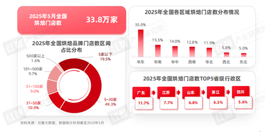 紅餐產(chǎn)業(yè)研究院在《烘焙品類發(fā)展報告2025》中勾勒出行業(yè)高度分散的圖景,截至2025年5月,全國烘焙門店數(shù)已達33.8萬家,其中門店數(shù)在5-30家的烘焙品牌占比49.3%,門店數(shù)在500家以上的品牌僅占1.6%,大量品牌停留在區(qū)域連鎖和“小連鎖”階段。