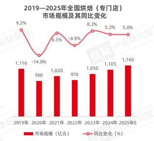 老牌和新品牌遇到的困難不一樣,但都很具體。盡管競爭激烈,但市場基本盤仍在擴大。根據(jù)紅餐的測算,2024年我國烘焙市場規(guī)模同比增長5.2%,達1105億元,預(yù)計2025年有望增至1160億元,說明整體需求并未縮小,而是在緩慢擴容。