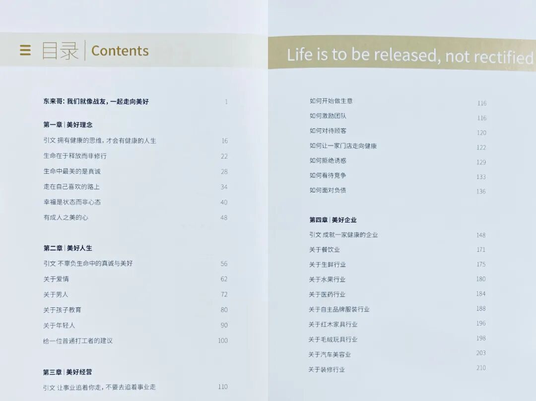 該書一共214頁,合計127000字,分四個篇章,第一章“美好理念”,第二章“美好人生”,第三章“美好經(jīng)營”,第四章“美好企業(yè)”,主要內(nèi)容為近年來東來哥(胖東來創(chuàng)始人于東來)在抖音平臺與網(wǎng)友直播連線中的深度分享,經(jīng)系統(tǒng)梳理、歸納、提煉后整理成冊,分模塊分要點闡述傳播美好的生活理念和科學(xué)的方式方法。