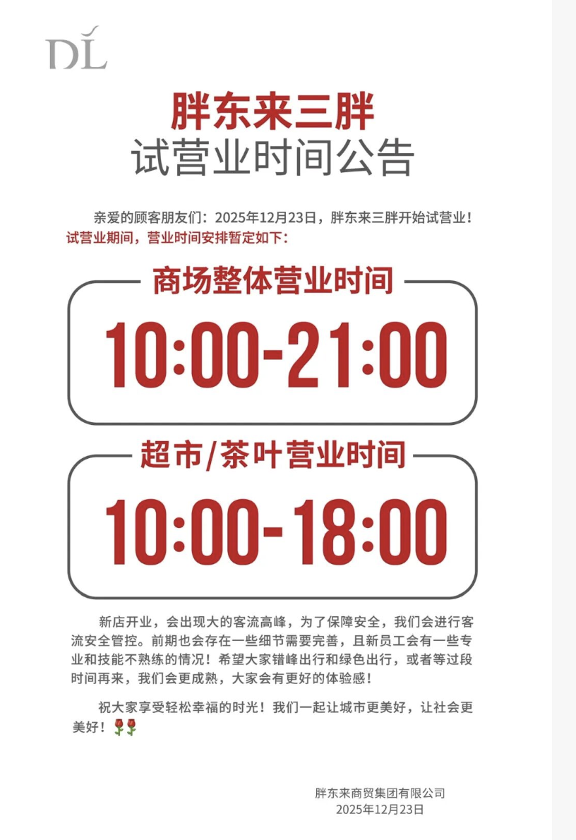聯(lián)商快訊:12月23日凌晨,新鄉(xiāng)胖東來大胖官方微信公眾號(hào)宣布,新鄉(xiāng)胖東來三胖將于12月23日上午10點(diǎn)開啟試營業(yè),正式開門迎客。