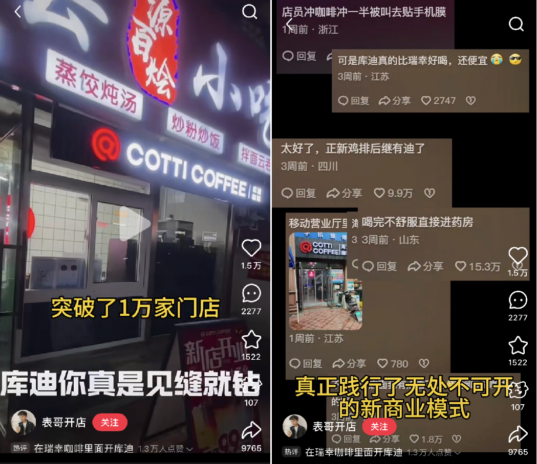 “店中店”的另一位資深玩家?guī)斓稀苍鴮⒖Х葯C(jī)搬進(jìn)便利店,還悄悄潛入沙縣小吃、居民樓、藥店、手機(jī)店,遭網(wǎng)友調(diào)侃“見(jiàn)到條縫就能鉆”“店員沖咖啡一半被叫去貼膜”。2024年底,庫(kù)迪暫停便捷店招商,重新優(yōu)化運(yùn)營(yíng)模式。