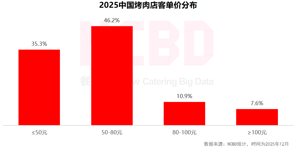 5、從客單價來看,46.2%的烤肉店客單價在50—80元之間;35.3%的烤肉店客單價低于50元;7.6%的烤肉門店客單價高于100元