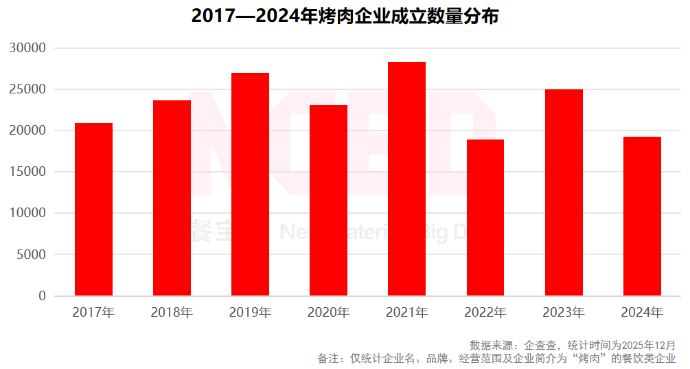 2、截至2025年12月,全國范圍內(nèi)共有11.6萬家烤肉相關(guān)餐飲企業(yè);2024年新成立的烤肉企業(yè)數(shù)量為1.9萬;2025年1—11月,新成立的烤肉相關(guān)餐飲企業(yè)數(shù)量達(dá)1.5萬