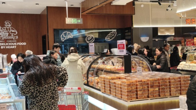 現(xiàn)場加工與餐飲化體驗成為新亮點。調(diào)改后,店內(nèi)烘焙與熟食的占比從原有的約5%增長至20%左右,現(xiàn)場制作檔口大幅增加,除了原有的烘焙現(xiàn)烤區(qū)外,新增了現(xiàn)做的包子、鮮肉餅,以及烤雞、現(xiàn)炸水餃等熱門即食商品,煙火氣滿滿。烘焙區(qū)新增了大量SKU,在延續(xù)網(wǎng)紅品如山茶花山泉吐司、半斤榴蓮肉榴蓮千層、核桃滿滿的同時,亦結(jié)合冬季草莓季,推出了如“草莓奶油盒子蛋糕”等時令主題產(chǎn)品。