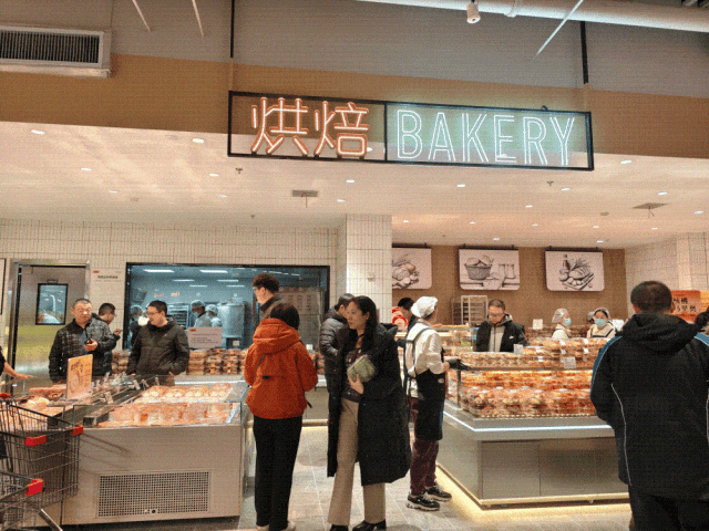 走進(jìn)賣場(chǎng),左側(cè)為烘焙區(qū)與熟食區(qū),主打“現(xiàn)制現(xiàn)售”,提供試吃服務(wù),且當(dāng)日出清,煙火氣十足;右側(cè)為水果區(qū)和蔬菜區(qū),實(shí)現(xiàn)新鮮直達(dá),直觀呈現(xiàn)商品品質(zhì)。