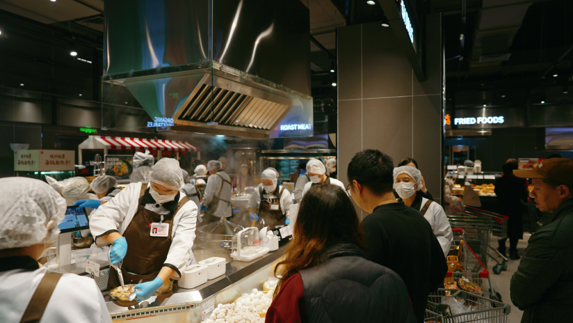 調(diào)改后,現(xiàn)場加工與即食體驗(yàn)成為最大亮點(diǎn)之一。烘焙與熟食的占比從原有的約5%大幅增長至25%左右,熟食區(qū)新增了多個(gè)美食檔口,提供北京烤鴨、現(xiàn)炒板栗紅薯、香氣四溢的烤雞、三文魚壽司、現(xiàn)包水餃、牛肉卷、漢堡、披薩、涼皮等豐富選擇,煙火氣十足。