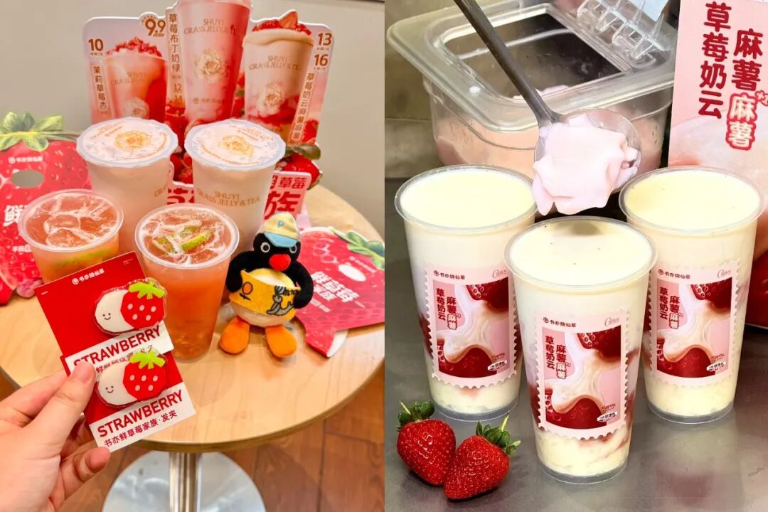 與此同時(shí),書(shū)亦燒仙草還延續(xù)“有料有趣”的產(chǎn)品理念。比如草莓奶云麻薯,用烏龍茶湯、真牛乳,搭配新鮮草莓、泰國(guó)米粒糯香麻薯,讓消費(fèi)者可以“嚼著喝”,豐富口感層次。
