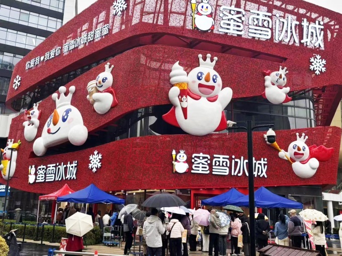 蜜雪冰城的杭州旗艦店就是例子。它沒選熱鬧地段,反而開在客流慘淡的西溪銀泰。12月底開業(yè)后,排起了長隊,成了整個商圈的引流核心。本地人調(diào)侃:“難道雪王要振興西溪銀泰?”