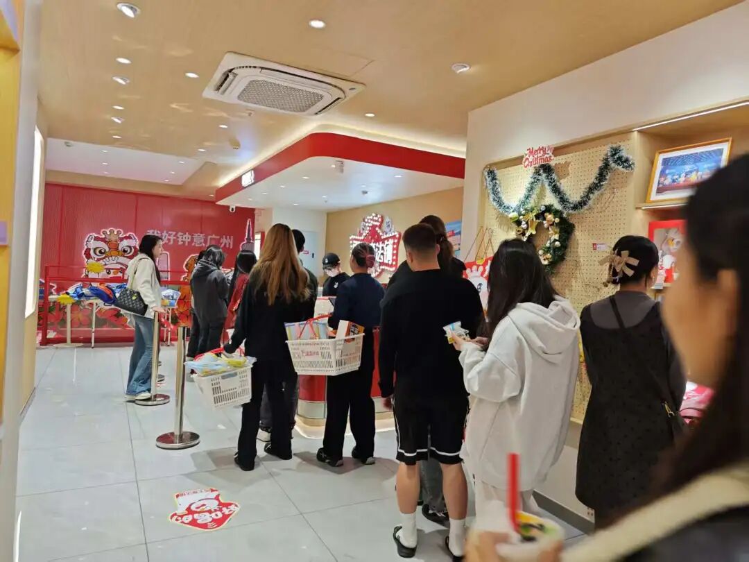 內(nèi)參君特地探店了廣州旗艦店,里頭擠的全是年輕人,學(xué)生群體居多。人人拎著購物籃,在二樓“雪王魔法鋪”里轉(zhuǎn),挑上滿滿一籃子周邊和零食。不少人結(jié)完賬,當(dāng)場就拆盲盒。