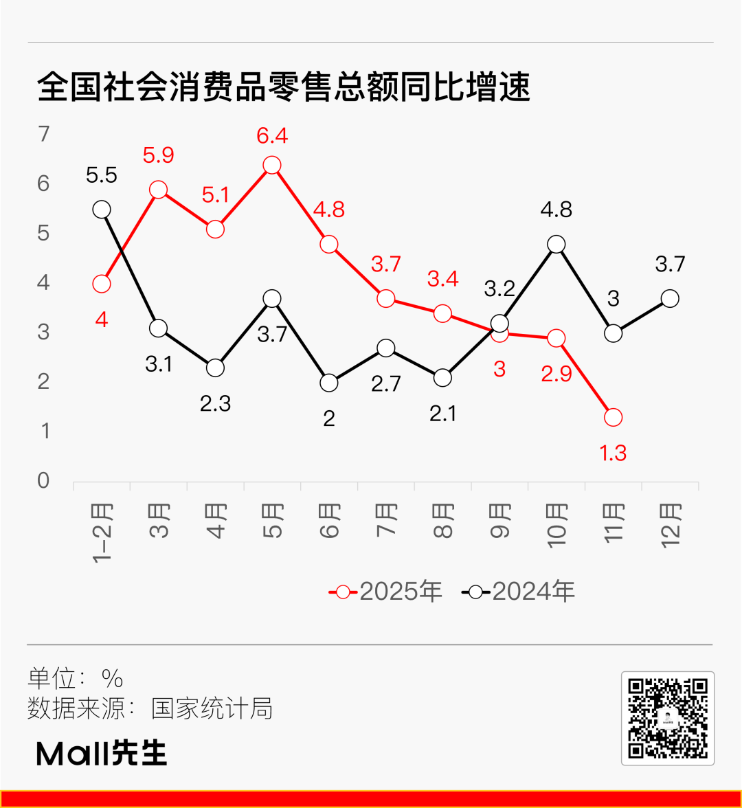先看一組大家都已經(jīng)很熟的數(shù)字——2025年1-11月,全國社會消費品零售總額同比增長4%。