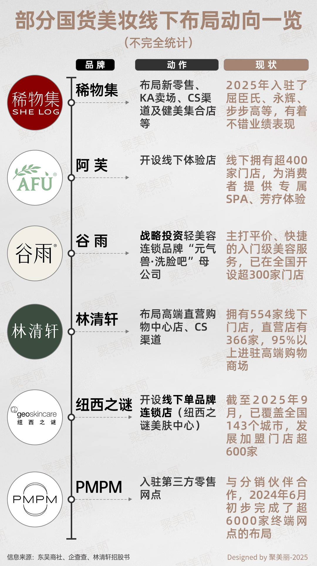 與規(guī)模企業(yè)面臨的增長焦慮不同,中小品牌與線下連鎖的處境更為嚴峻。據(jù)聚美麗不完全統(tǒng)計,2025年已有超30個國內(nèi)外美妝品牌在華閉店、宣布停運以及退出中國市場,其中國貨美妝品牌占17個,且多為中小規(guī)模的新銳品牌。